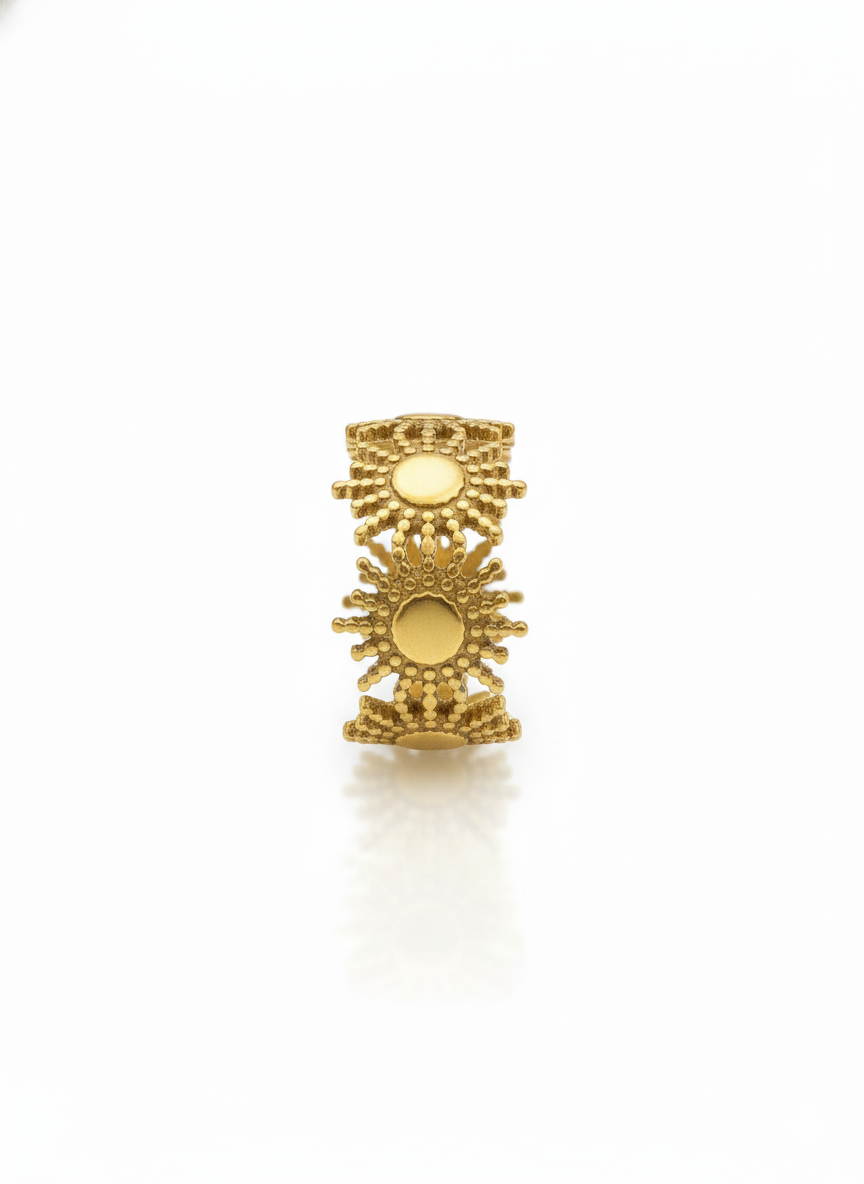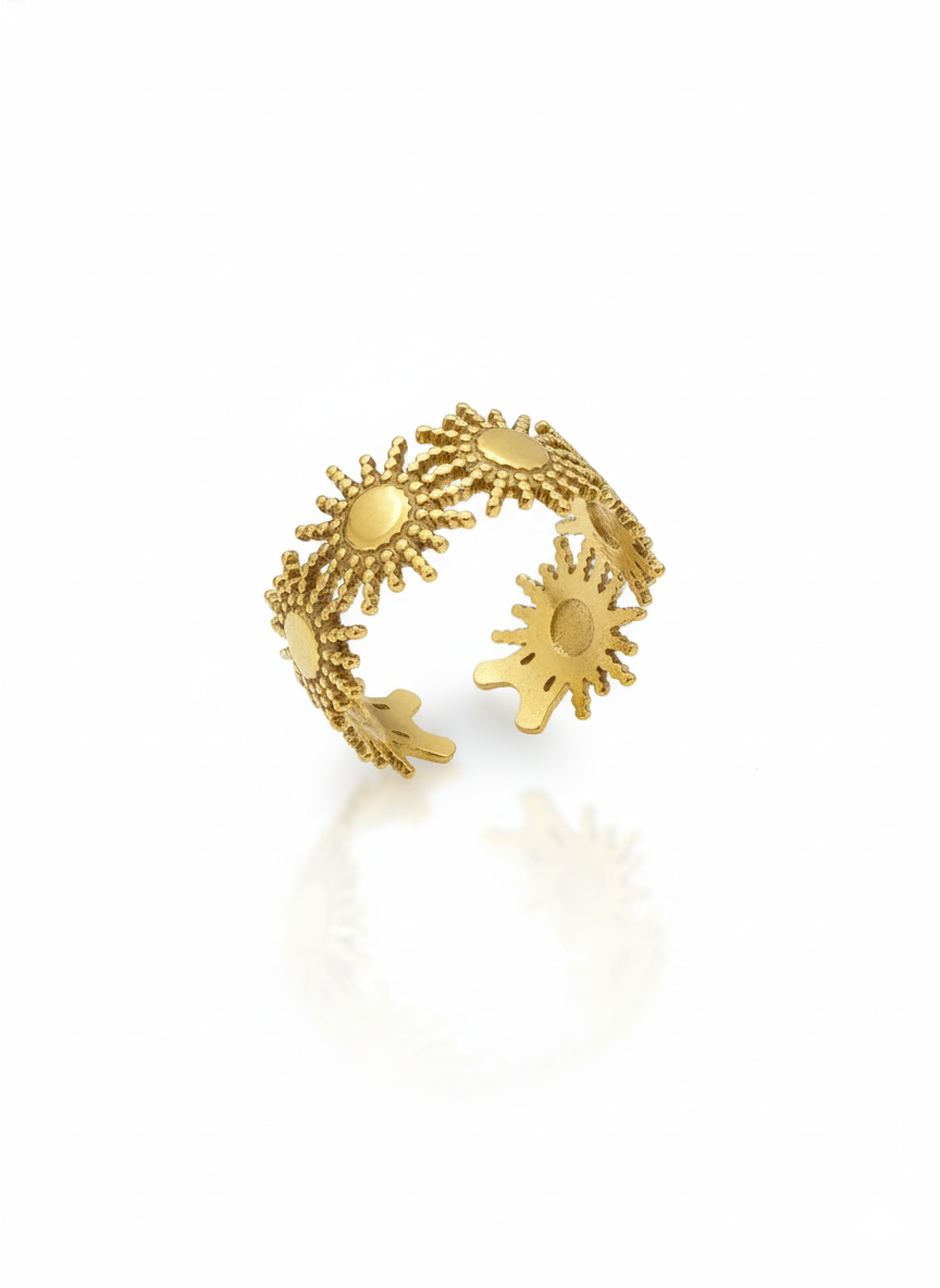 Esta pieza, creada en acero inoxidable con un acabado dorado, presenta pequeños soles enlazados que simbolizan energía y vitalidad. Su formato abierto y ajustable permite que se adapte con facilidad a cualquier dedo, ofreciendo comodidad durante todo el día.