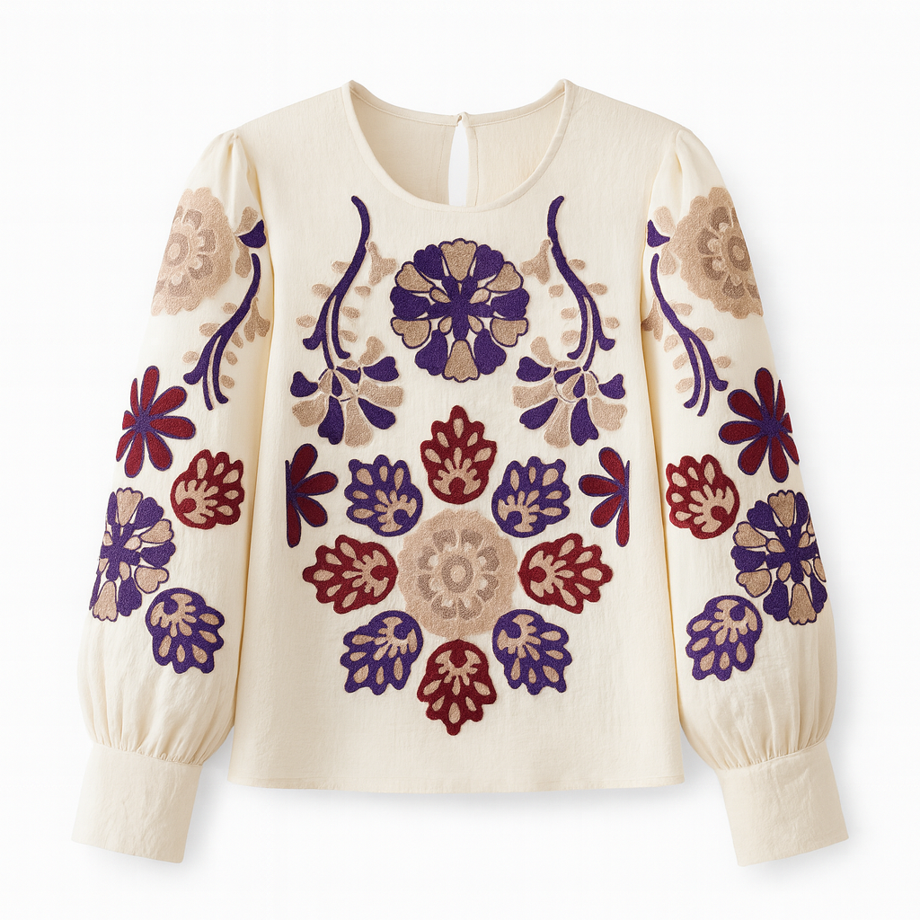 Sobre una base crudo de tacto suave, esta blusa luce un bordado artesanal en tonos morado, granate y beige que recorre delantero y mangas con motivo floral geométrico.