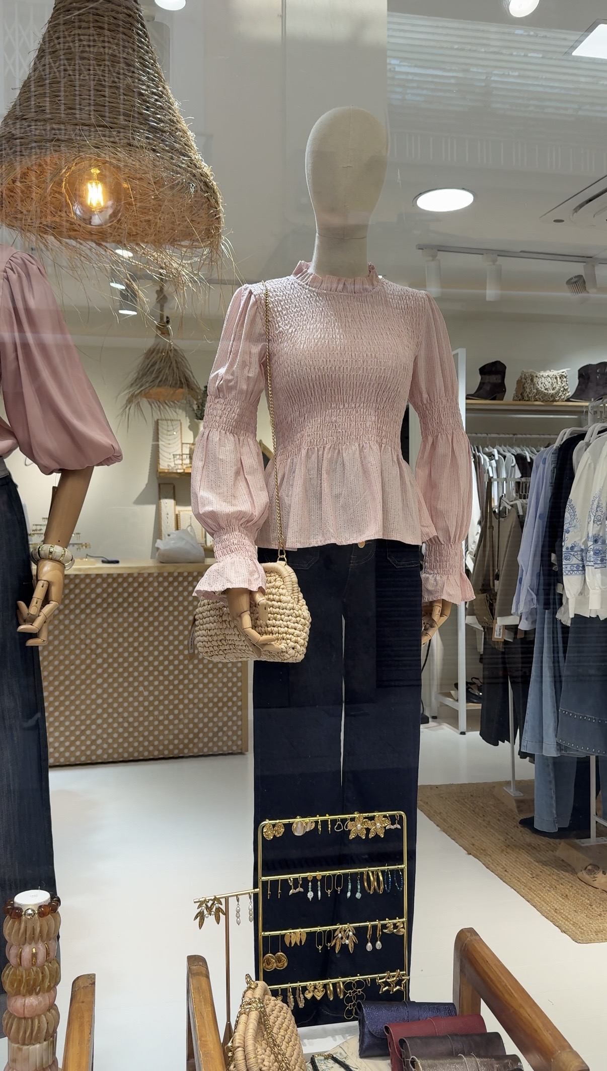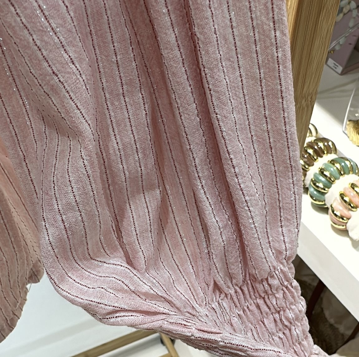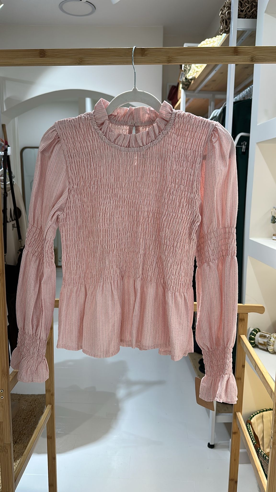 Detalles que la hacen brillar: Lo que realmente eleva a la Blusa Sofia es su exquisito tejido. Sobre una base de color rosa empolvado, se entrelazan delicadas rayas verticales de lurex plateado, creando un juego de luces sutil que la hace perfecta tanto para un evento de día como para una cena especial. Sus mangas largas abullonadas con puños elásticos fruncidos añaden ese volumen dramático y elegante tan buscado, mientras que el cuello perkins con acabado volante enmarca el rostro con una dulzura irresistible. 🌟🧵