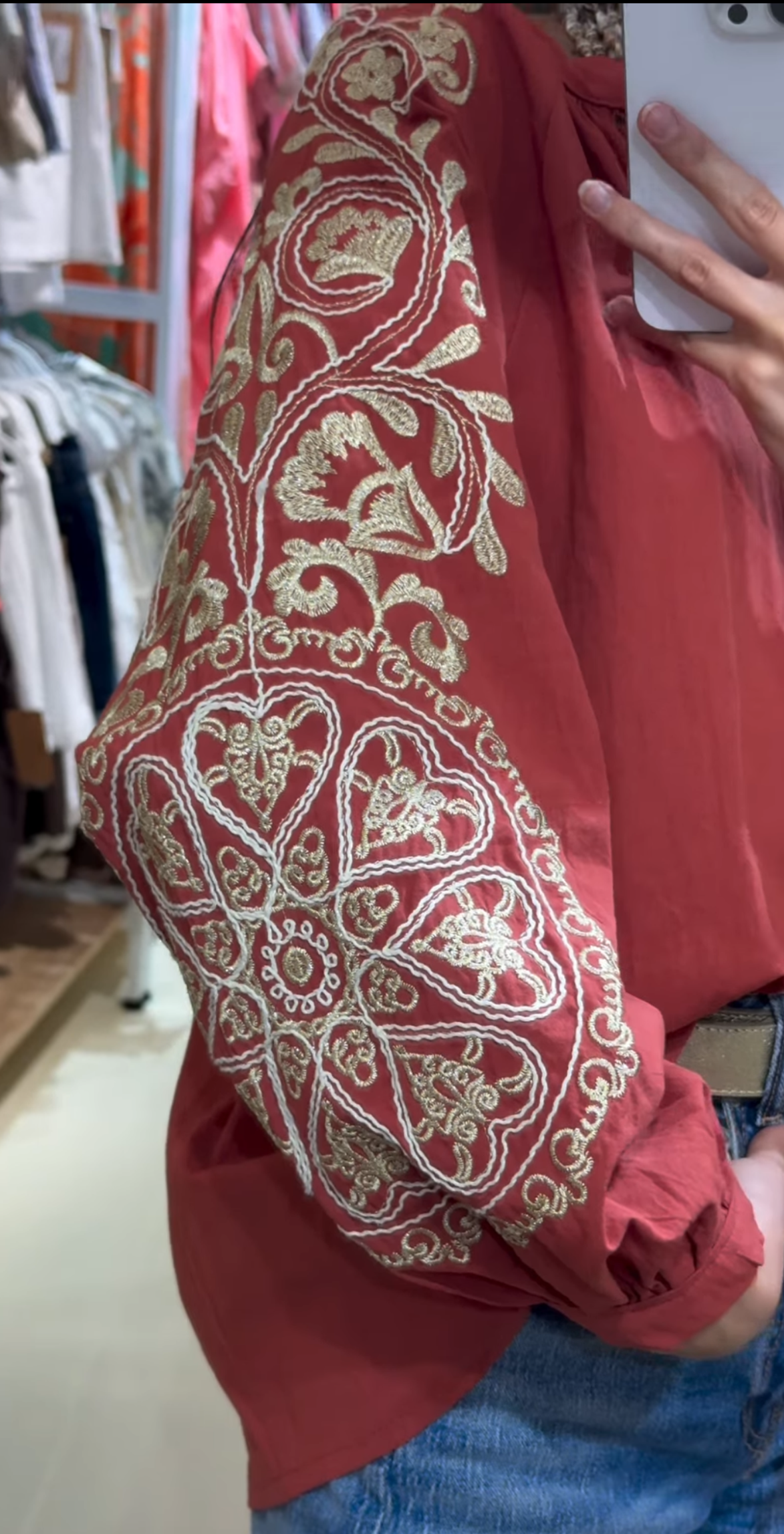 Blusa boho en azul navy con bordados beige en mangas, escote en V, botones forrados y puños elásticos.