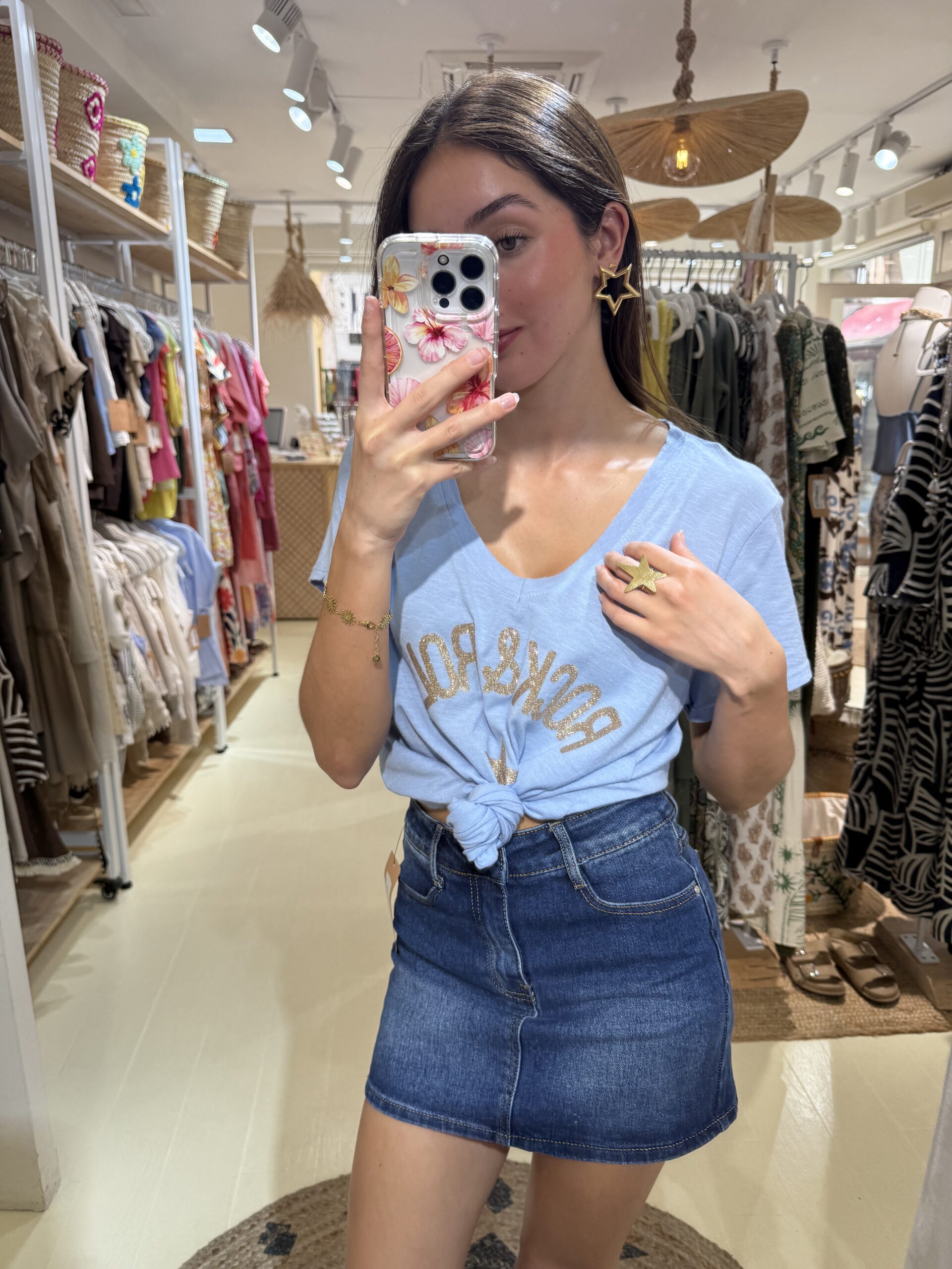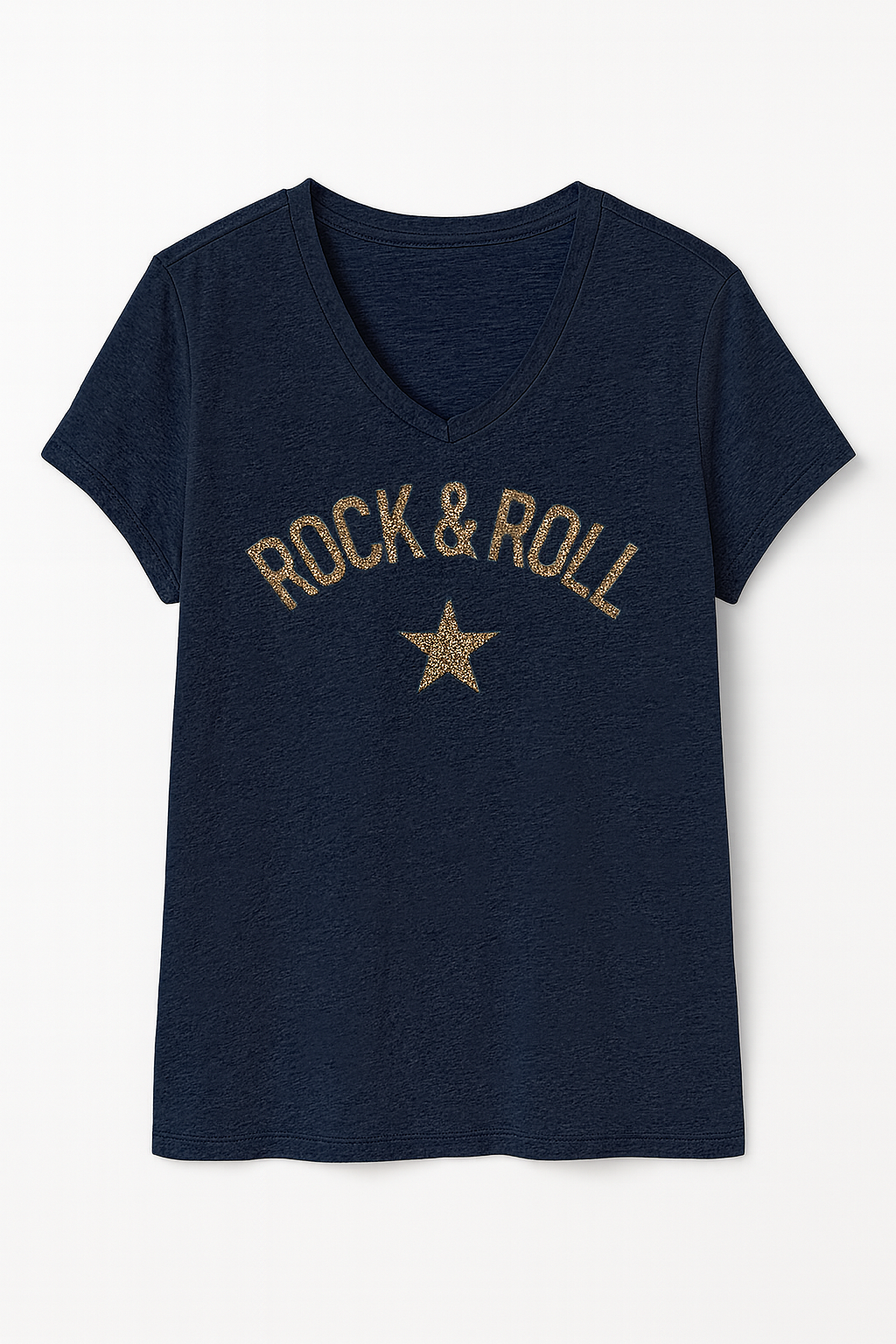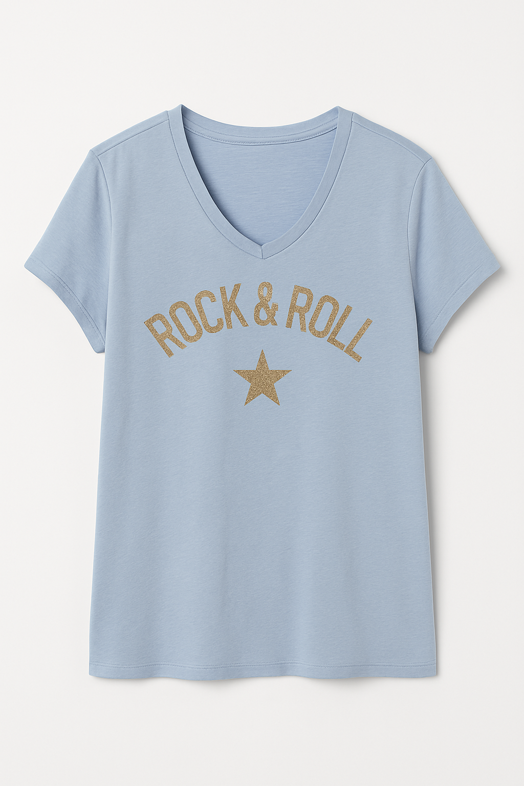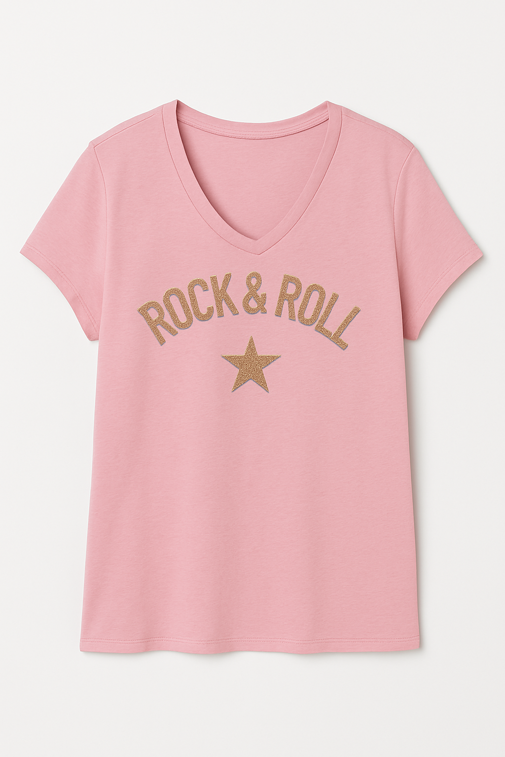Camiseta de algodón suave con escote en pico y estampado glitter dorado «ROCK & ROLL». Disponible en colores pastel.