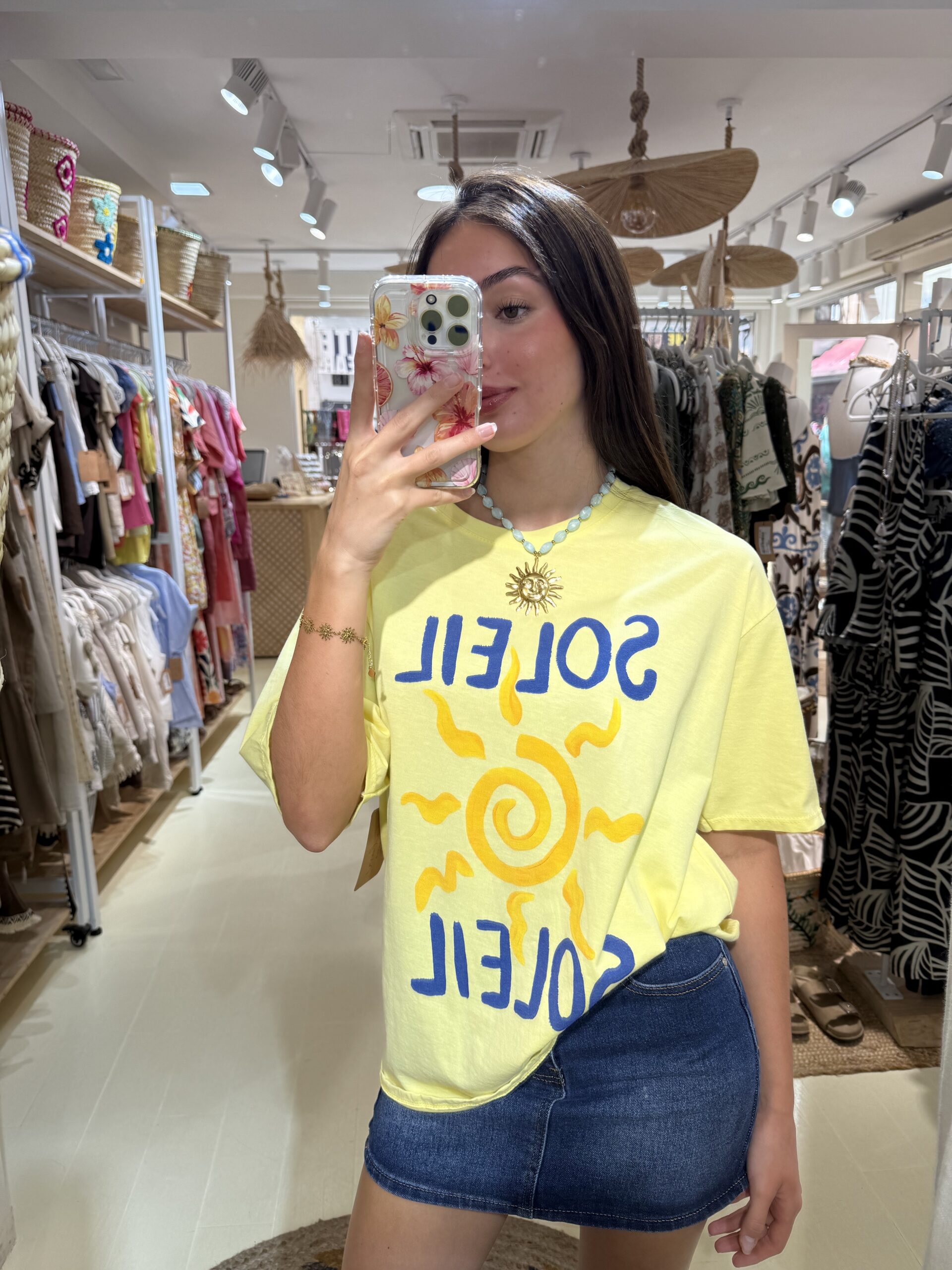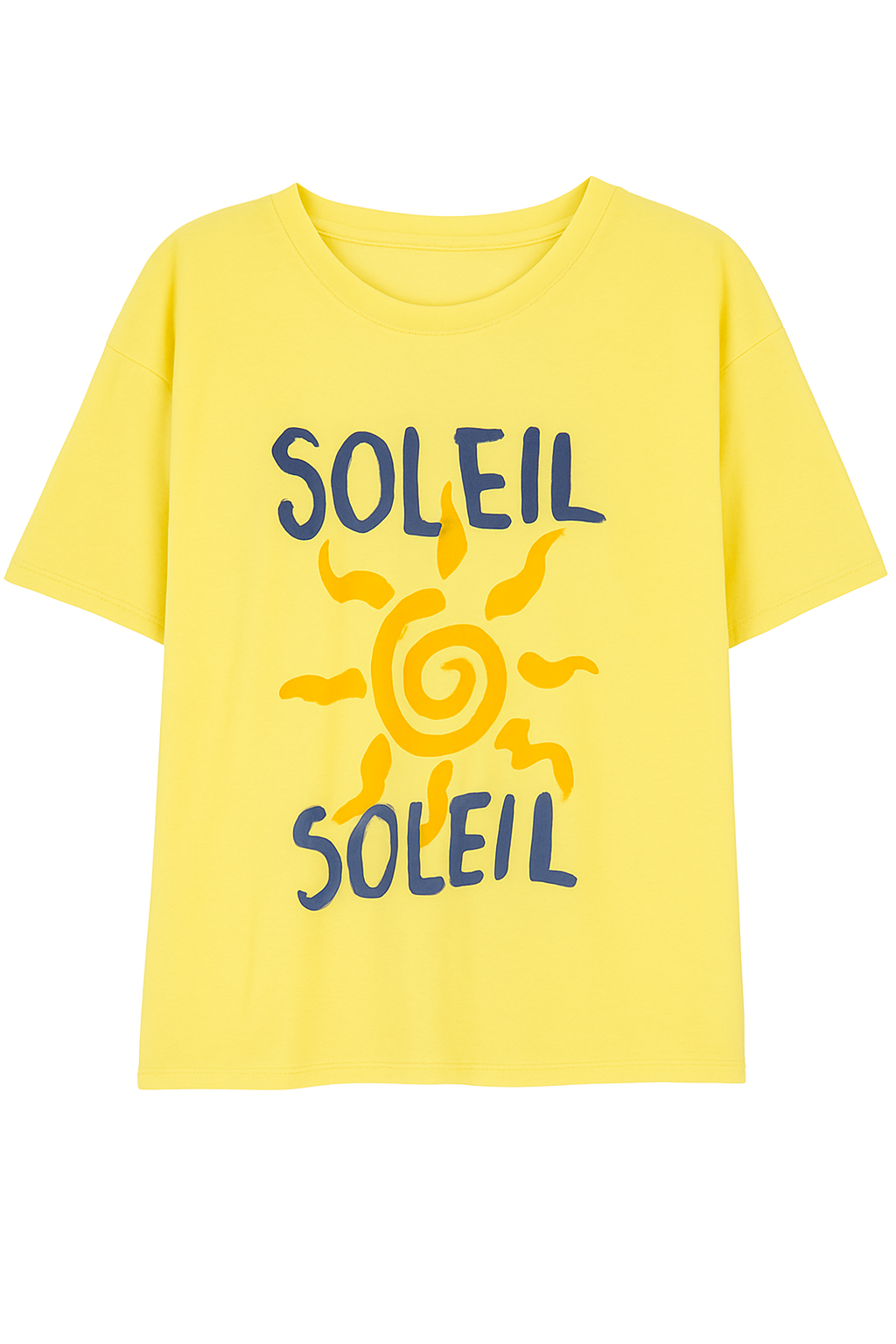 Ilumina tu outfit con esta vibrante camiseta amarilla “SOLEIL SOLEIL”. Confeccionada en suave algodón de alta calidad, ofrece un corte relajado que se adapta cómodamente a cualquier tipo de cuerpo. Su diseño gráfico estampado en el frente —con tipografía artística en azul marino y un sol en tonos cálidos— aporta personalidad, alegría y un toque bohemio a tus días.