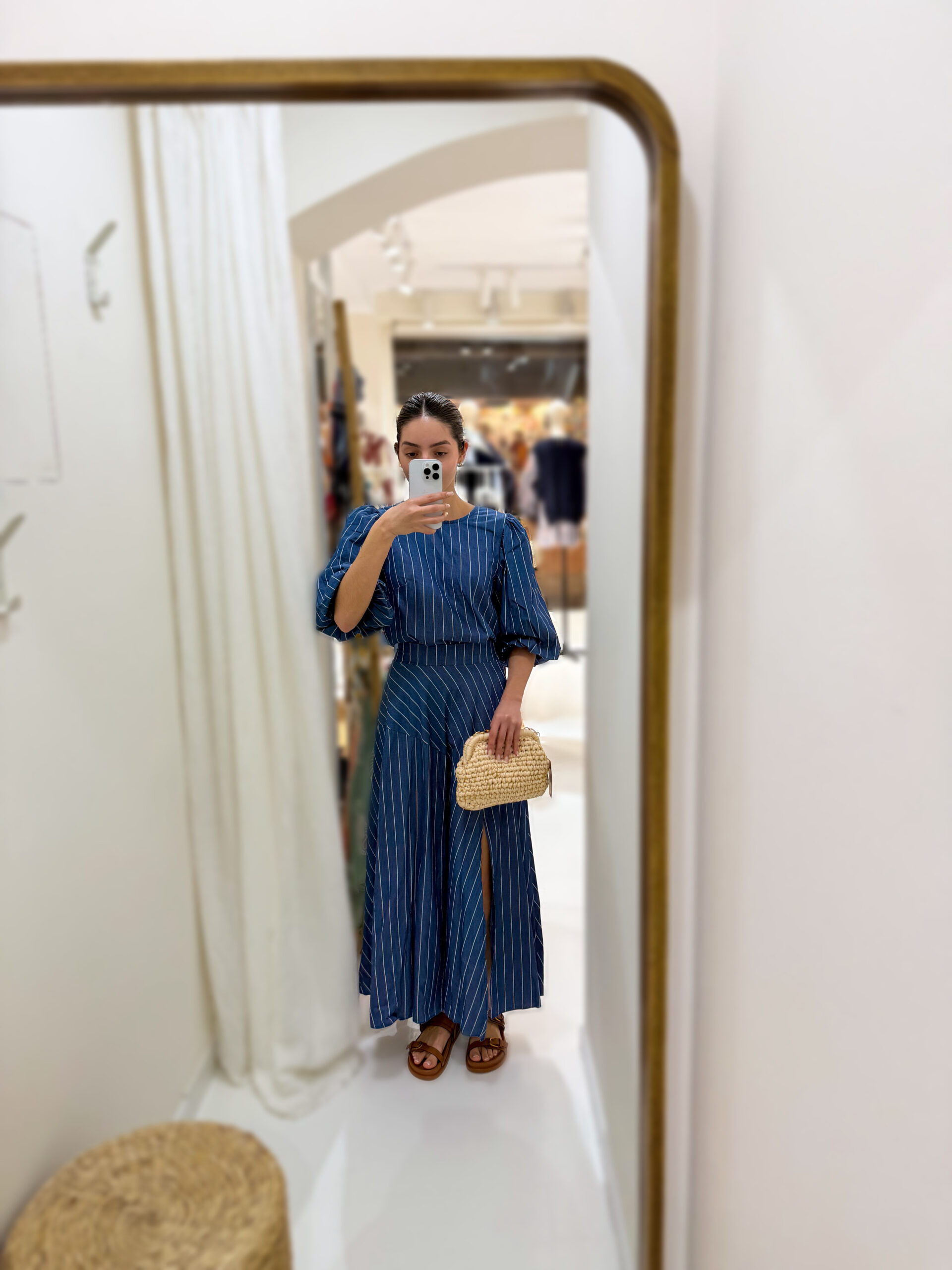 Este set coordina un top corto de mangas abullonadas 3/4 y una falda ‘midi’ fluida en un precioso tono azul índigo con sutiles rayas blancas y una raja más que ideal.