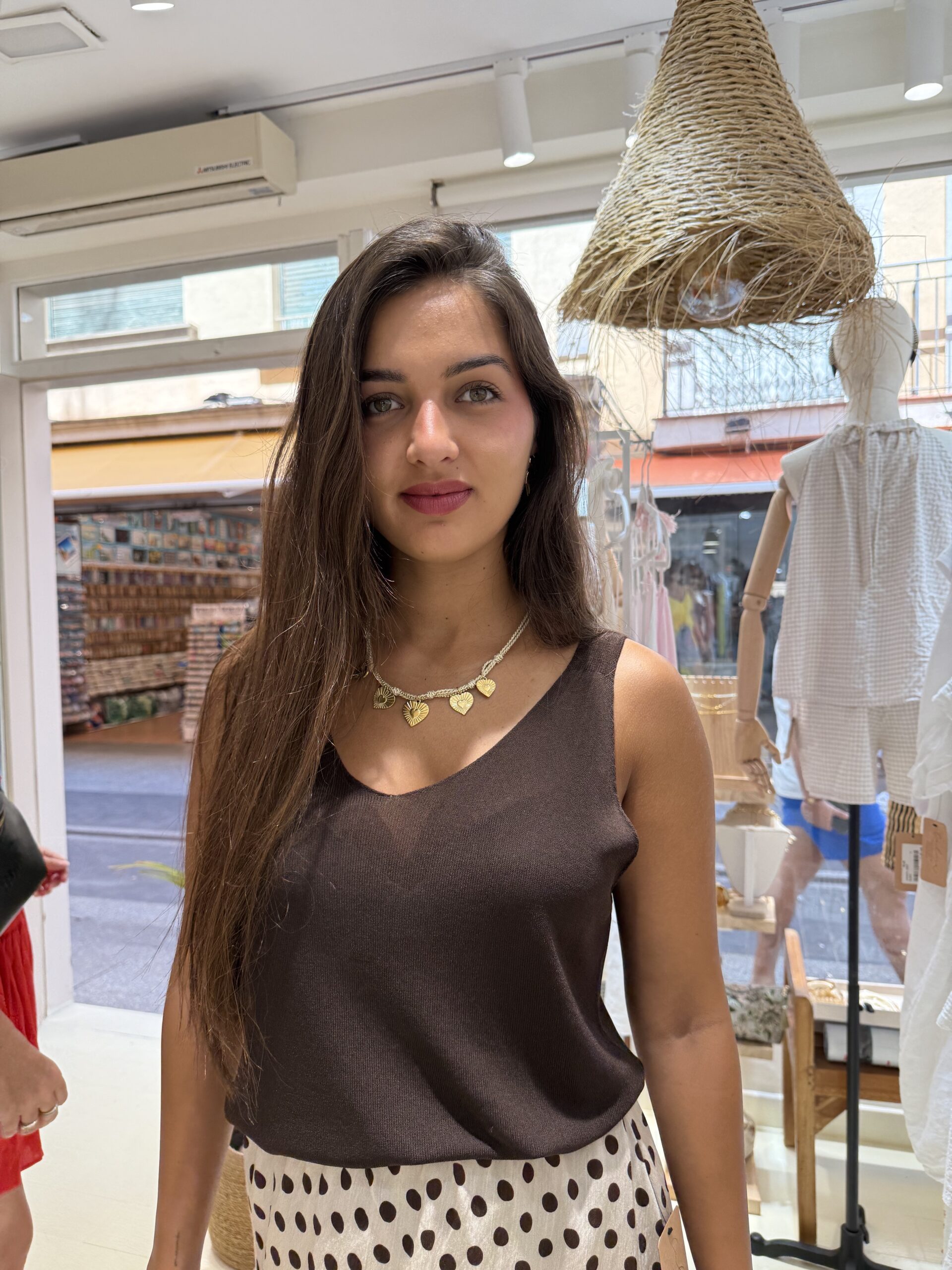 Los tirantes anchos cubren bien el sujetador y el escote redondo estiliza el cuello.